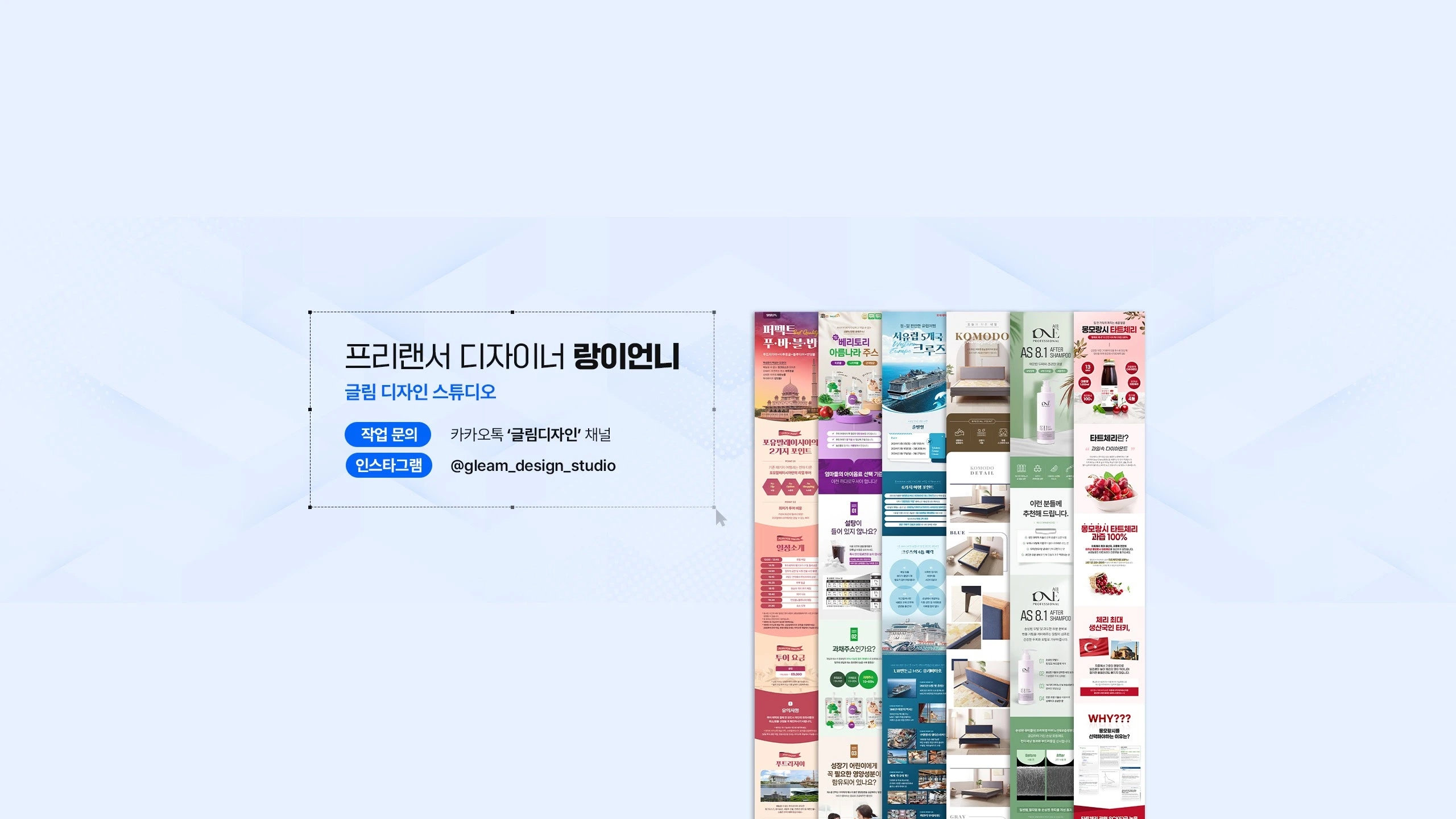 프리랜서 웹컨텐츠 디자이너 ‘랑이언니’ 신현경 입니다. 프리랜서 디자이너로서 자리잡기까지의 이야기, 디자인 꿀팁, 디자인 튜토리얼을 알려드리고, 종종 프리랜서 디자이너인 제 일상을 공개합니다😊 - 💁🏻♀️작업 문의(이메일) : [email protected] 💁🏻♀️작업 문의(카카오톡) : http://pf.kakao.com/_NWxoIG 🌟개인 인스타그램 : @1994cm730kg #글림디자인스튜디오